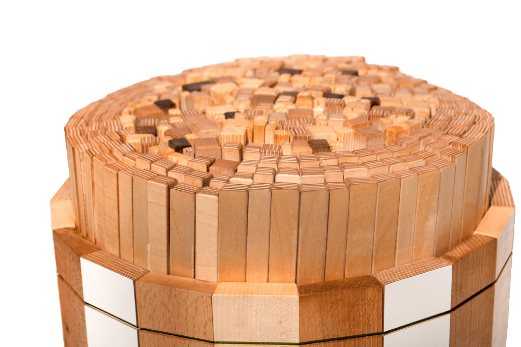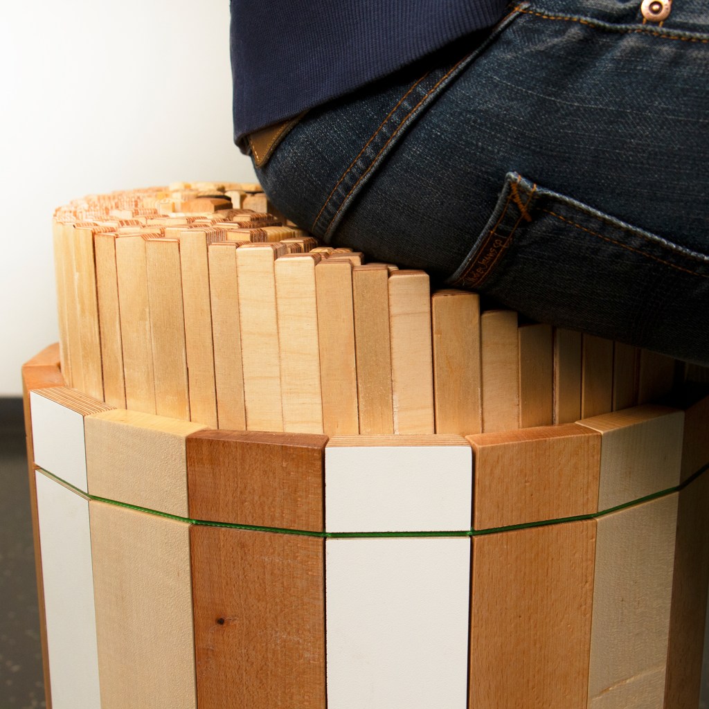 Ergoflex 2.0 ist ein innovativer Sitzhocker aus Restholz. Die Sitzfläche besteht aus vertikal angeordneten Holzstäbchen, die sich flexibel an die Körperkontur anpassen und sich somit bei jeder Bewegung an die Gesäßkontur anpasst. Zwei starke Schnüre halten die Konstruktion zusammen und unterstützen so die Flexibilität und Beweglichkeit des kompletten Hockers.