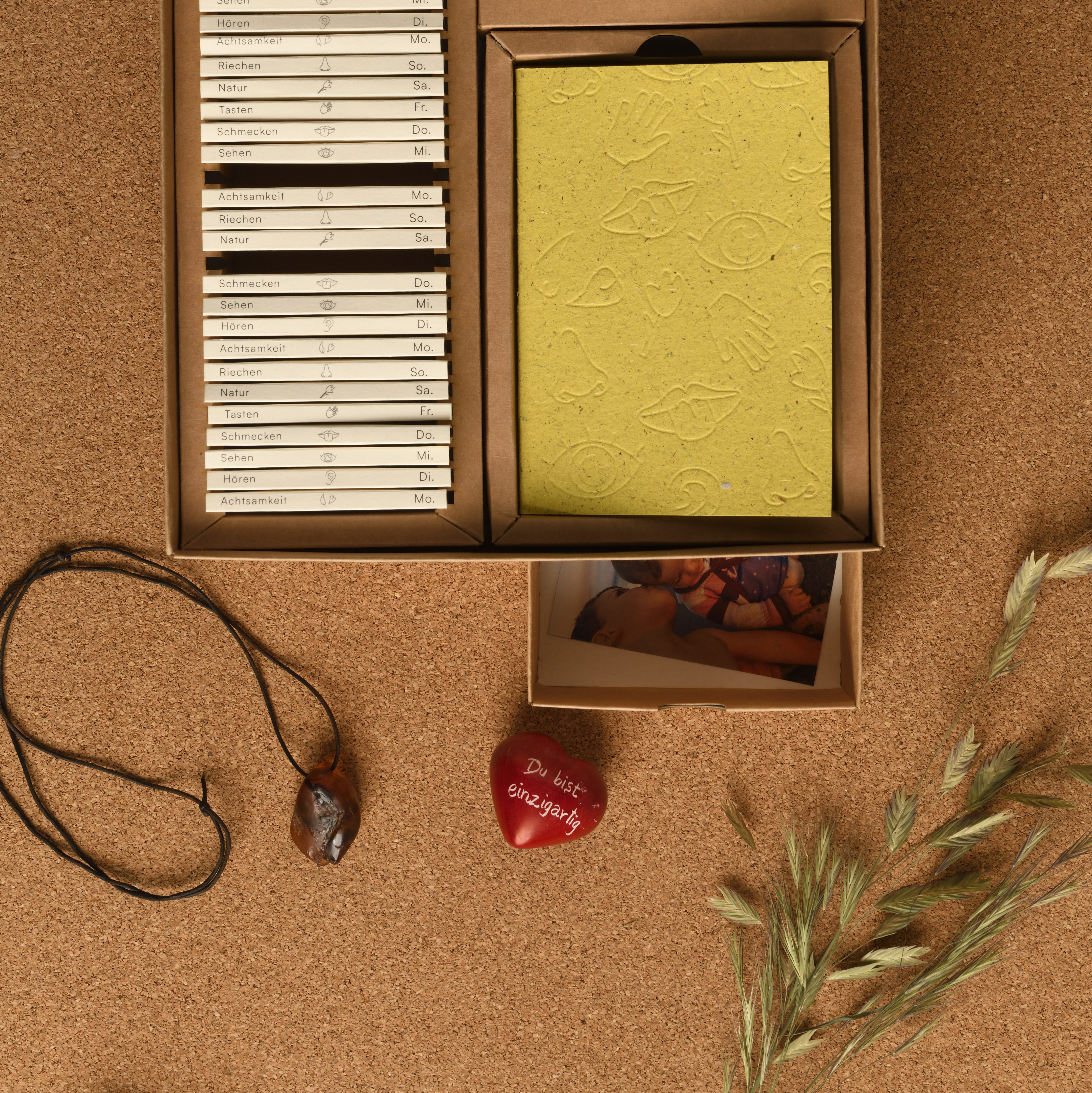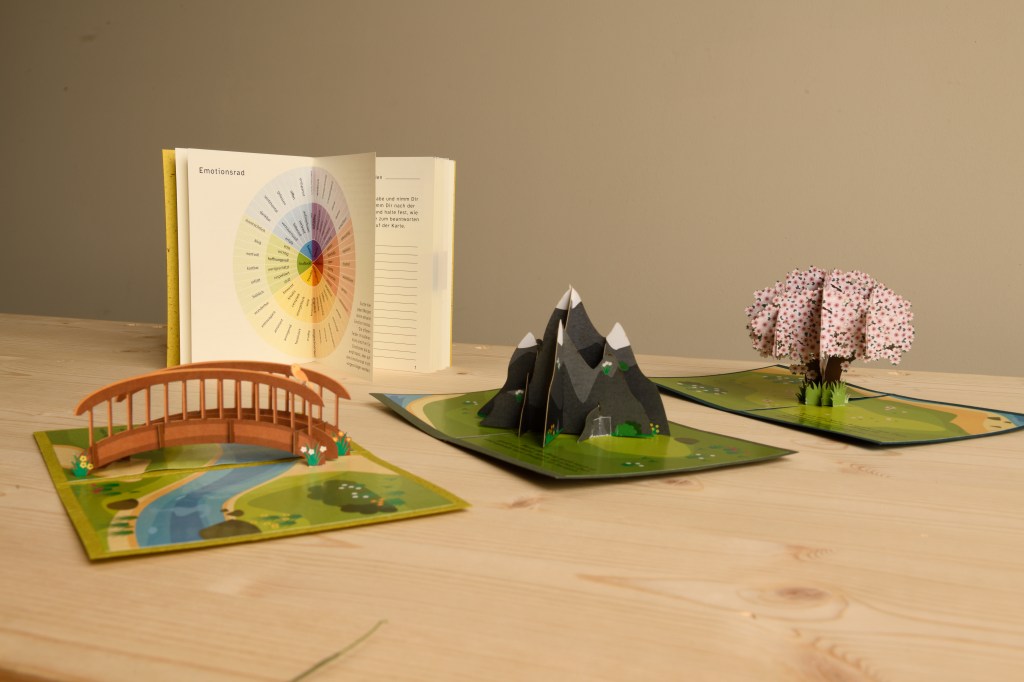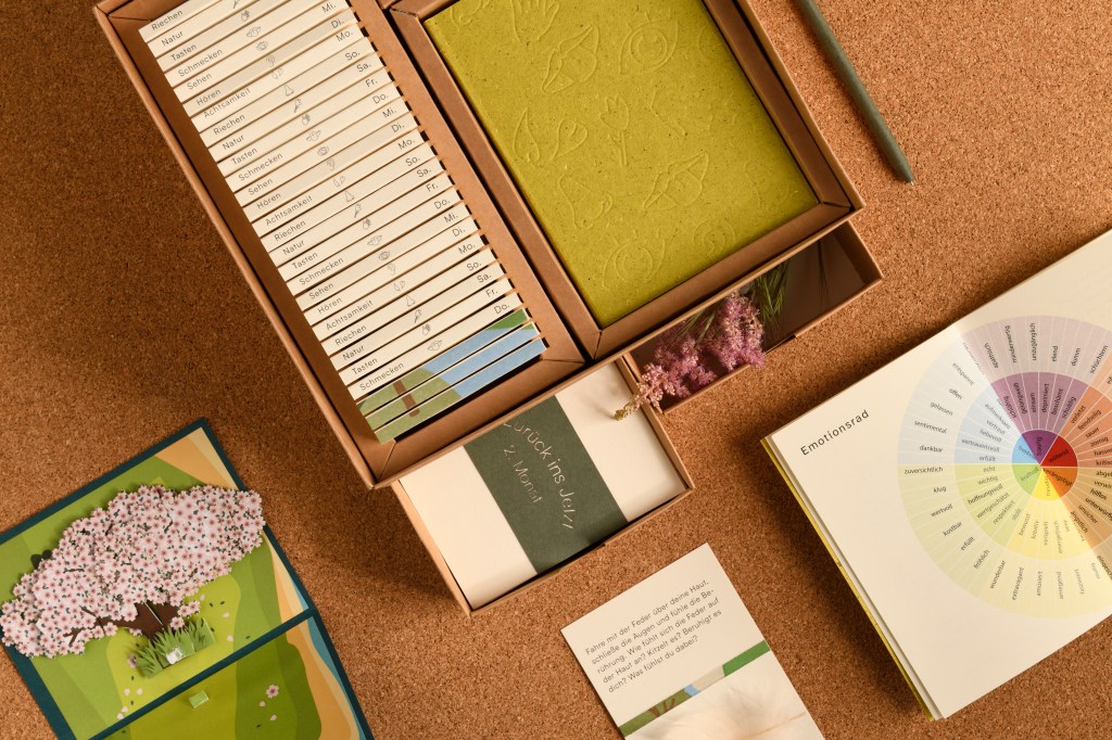 „Zurück ins Jetzt“ ist ein analoges Spiel, das Menschen mit leichter bis mittelgradiger Depression durch tägliche Sinnesübungen und Achtsamkeit wieder in Kontakt mit sich selbst,ihrem Körper und ihrer Umgebung bringt. Die Spieler*innen erleben 84 Tage lang kleine, alltagstaugliche Aufgaben, die dem Sehen, Hören, Tasten, Riechen, Schmecken, der Achtsamkeit und der Natur gewidmet sind. Ergänzt wird das Spiel durch strukturierte Reflexionstagebücher, Jokerkarten für herausfordernde Tage,sowie haptisch fühlbare Materialien, die einzelne Aufgaben erlebbarer machen. Ziel ist es, die Selbstwahrnehmung zu fördern, Freude im Kleinen zu entdecken und die eigene emotionale Resilienz zu stärken.